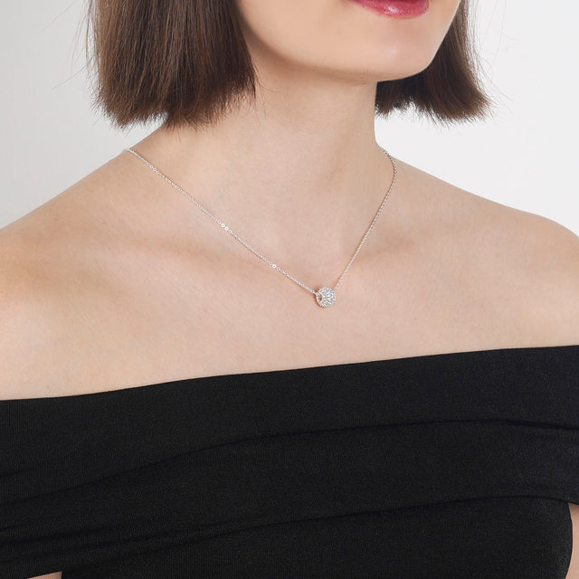 The resplendent Forever Love Necklace skillfully presents a meticulously refined heart pendant, delicately encasing an impeccable 0.19 inch (5mm), 0.5 carat cubic zirconia stone, lavishly embellished with smaller crystals that magnify its luminosity.