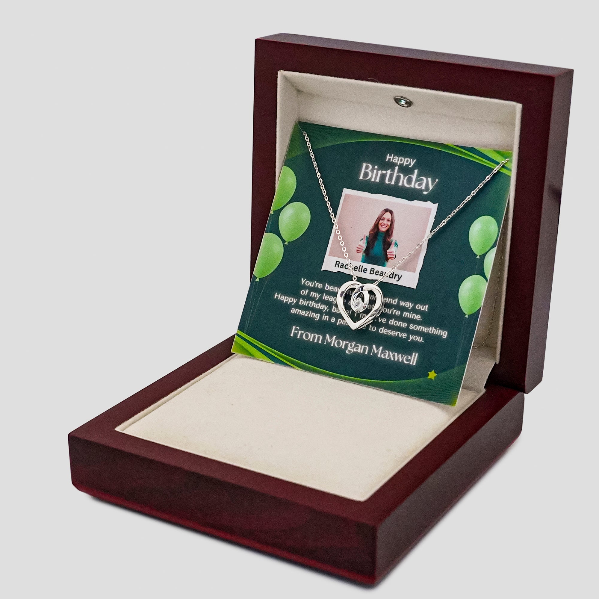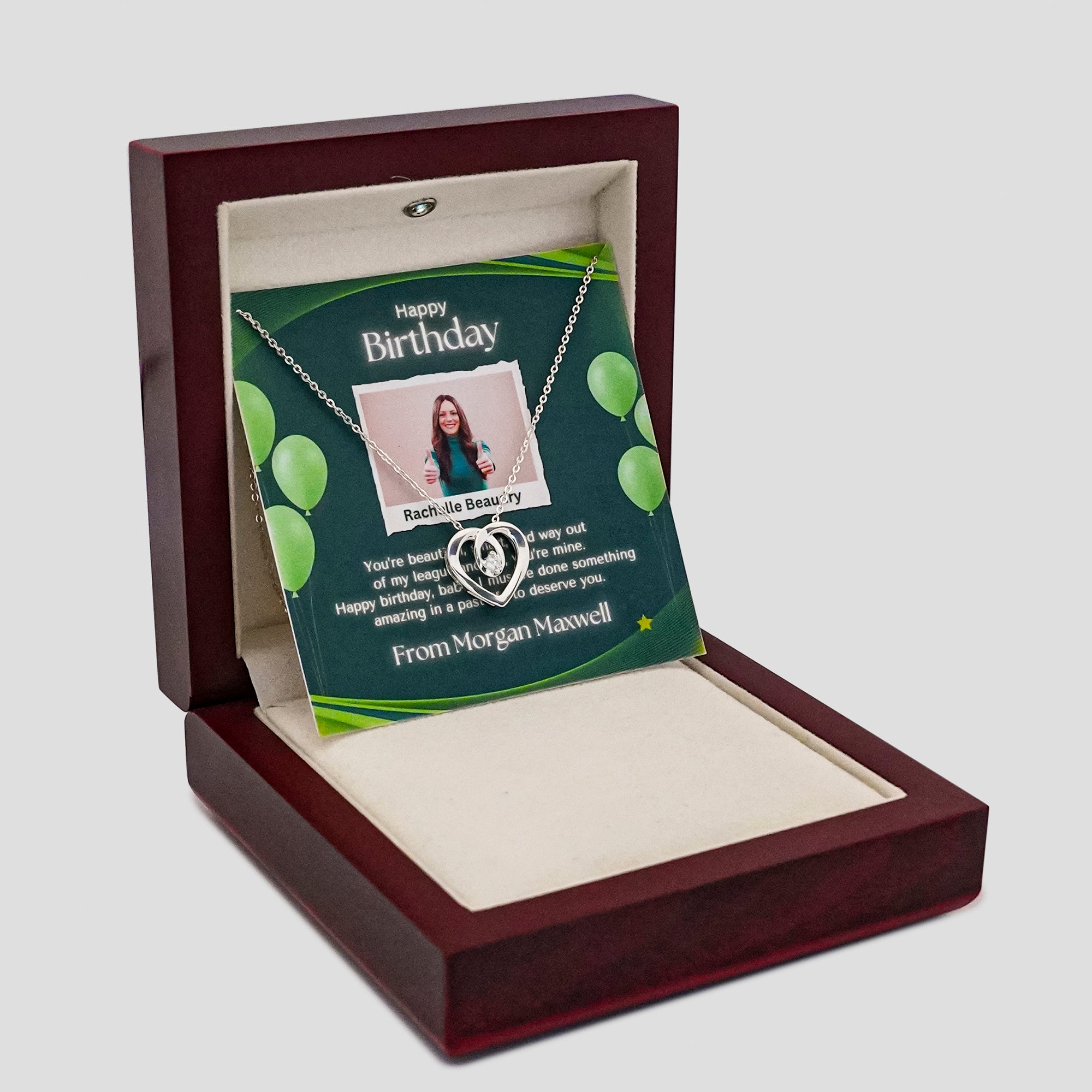 This beautifully curated gift box is a testament to your love story. It includes a beautiful silver necklace, a heartfelt card, all elegantly packaged in a luxurious wooden box with soft ambient lighting.